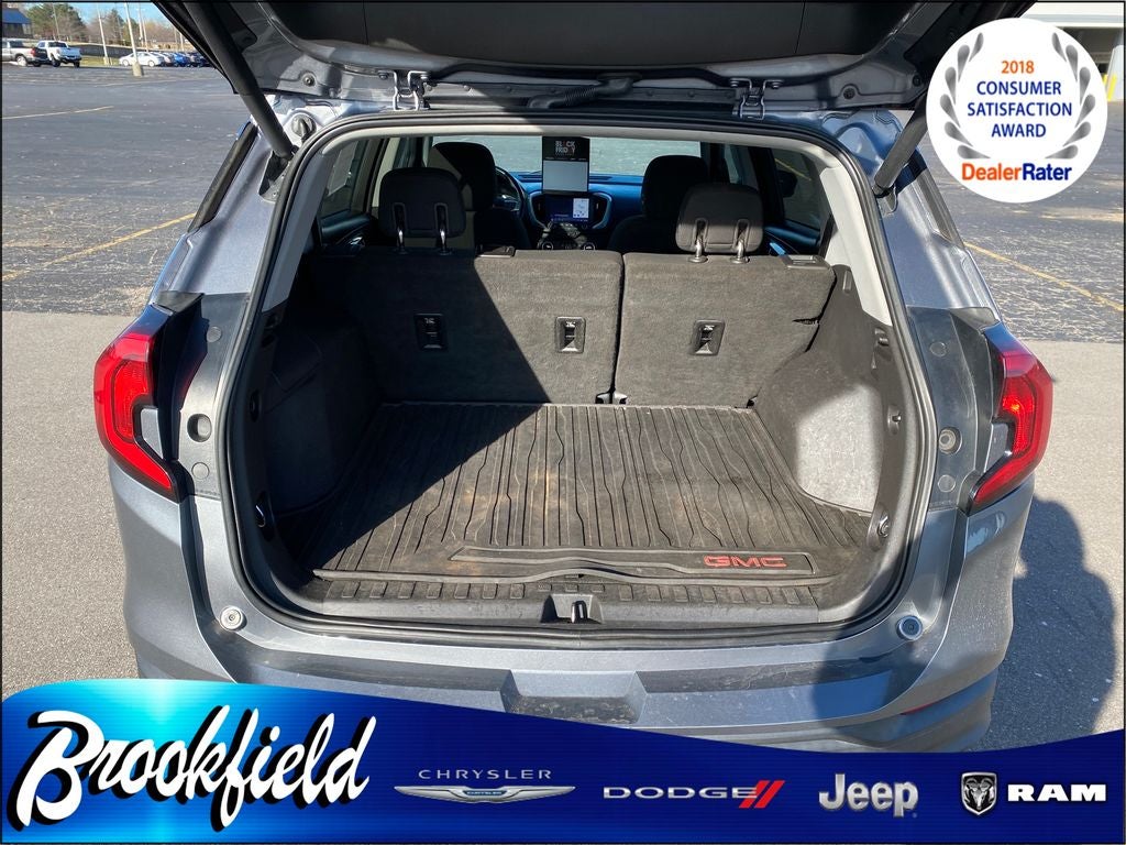 Satin Steel Metallic 2018 GMC Terrain SLE 1.5L DOHC 4D Sport Utility 24/28 City/Highway MPG This vehicle features Driver Convenience Package (8-Way Power Driver Seat Adjuster, Driver & Front Passenger Heated Seats, Dual-Zone Automatic Climate Control, Power Driver Lumbar Control, Remote Start, and Roof-Mounted Luggage Rack Black Side Rails), Infotainment Package I (110-Volt Power Outlet, 2 USB Data Ports, 4.2 Multi-Color Enhanced Driver Information Screen, Radio: GMC Infotainment Audio System w/Navigation, SD Card Reader, and SiriusXM Satellite Radio), Interior Protection Package (LPO) (All-Weather Cargo Mat (LPO) and All-Weather Floor Mats), License Plate Front Mounting Package, Preferred Equipment Group 3SA, AWD, 2018 GMC Terrain SLE, 2018 GMC Terrain SLE in Satin Steel Metallic, 2 USB Data Ports w/Auxiliary Input Jack, 3.47 Axle Ratio, 4-Way Manual Driver's Seat, 4-Way Manual Front Passenger Seat, 4-Wheel Disc Brakes, 6 Speakers, 6-Speaker Audio System Feature, ABS brakes, Air Conditioning, Alloy wheels, AM/FM radio, Apple CarPlay/Android Auto, Auto-dimming Rear-View mirror, Bluetooth® For Phone, Brake assist, Bumpers: body-color, Compass, Cruise Control, Delay-off headlights, Driver door bin, Driver vanity mirror, Dual front impact airbags, Dual front side impact airbags, Electronic Stability Control, Emergency communication system: OnStar Guidance, Exterior Parking Camera Rear, Four wheel independent suspension, Front anti-roll bar, Front Bucket Seats, Front Center Armrest, Front reading lights, Fully automatic headlights, Heated door mirrors, High-Intensity Discharge Headlights, Illuminated entry, Low tire pressure warning, Occupant sensing airbag, Outside temperature display, Overhead airbag, Overhead console, Panic alarm, Passenger door bin, Passenger vanity mirror, Power door mirrors, Power Programmable Rear Liftgate, Power steering, Power windows, Premium Cloth Seat Trim, Radio data system, Radio: GMC Infotainment Audio System w/7 Display, Rear anti-roll bar, Rear seat center armrest, Rear window defroster, Rear window wiper, Remote keyless entry, Security system, Speed-sensing steering, Split folding rear seat, Spoiler, Steering wheel mounted audio controls, Tachometer, Telescoping steering wheel, Tilt steering wheel, Traction control, Trip computer, Variably intermittent wipers, and Wheels: 17 x 7 Silver Painted Aluminum.